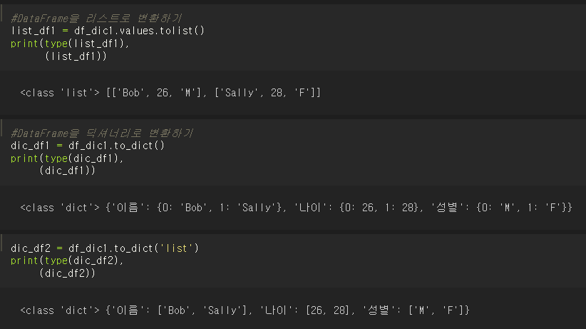 판다스 데이터프레임을 리스트, 딕셔너리로 변환