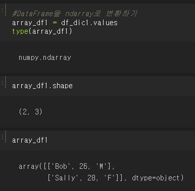 DataFrame 객체의 values를 이용하면 손쉽게 넘파이 배열로 변환할 수 있다.