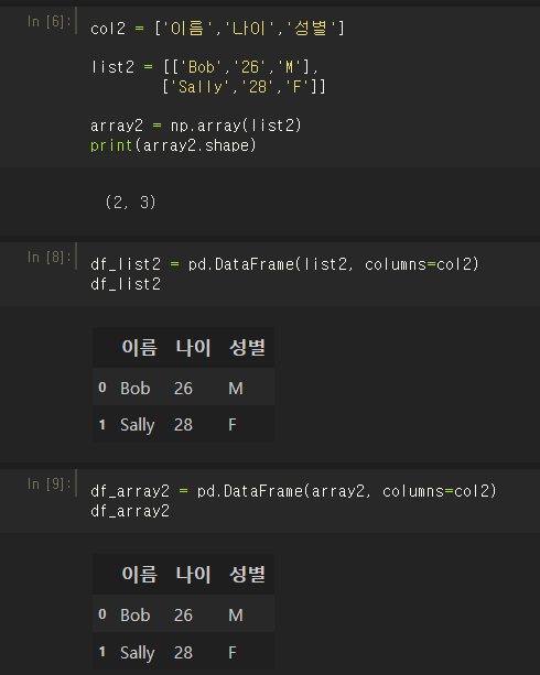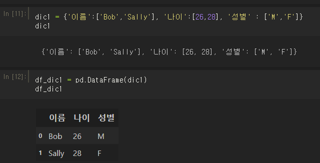 dic1 = {'이름':['Bob','Sally'], '나이':[26,28], '성별' : ['M','F']}