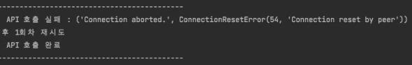 그 다음부터는 간헐적으로 ConnectionResetError(54, 'Connection reset by peer) 오류가 발생했다.