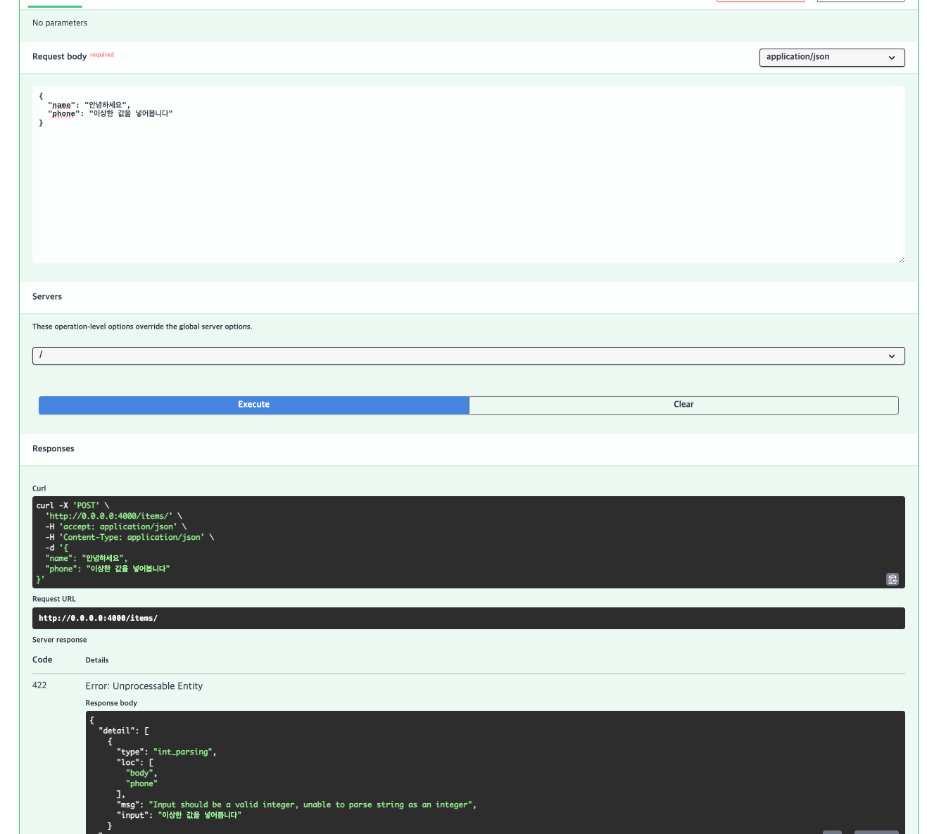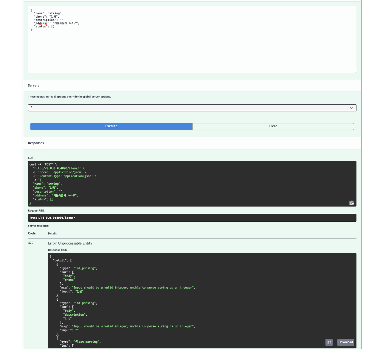 형식에 맞지 않는 데이터를 전송하면 아래와 같이 422 에러를 반환하게 된다.