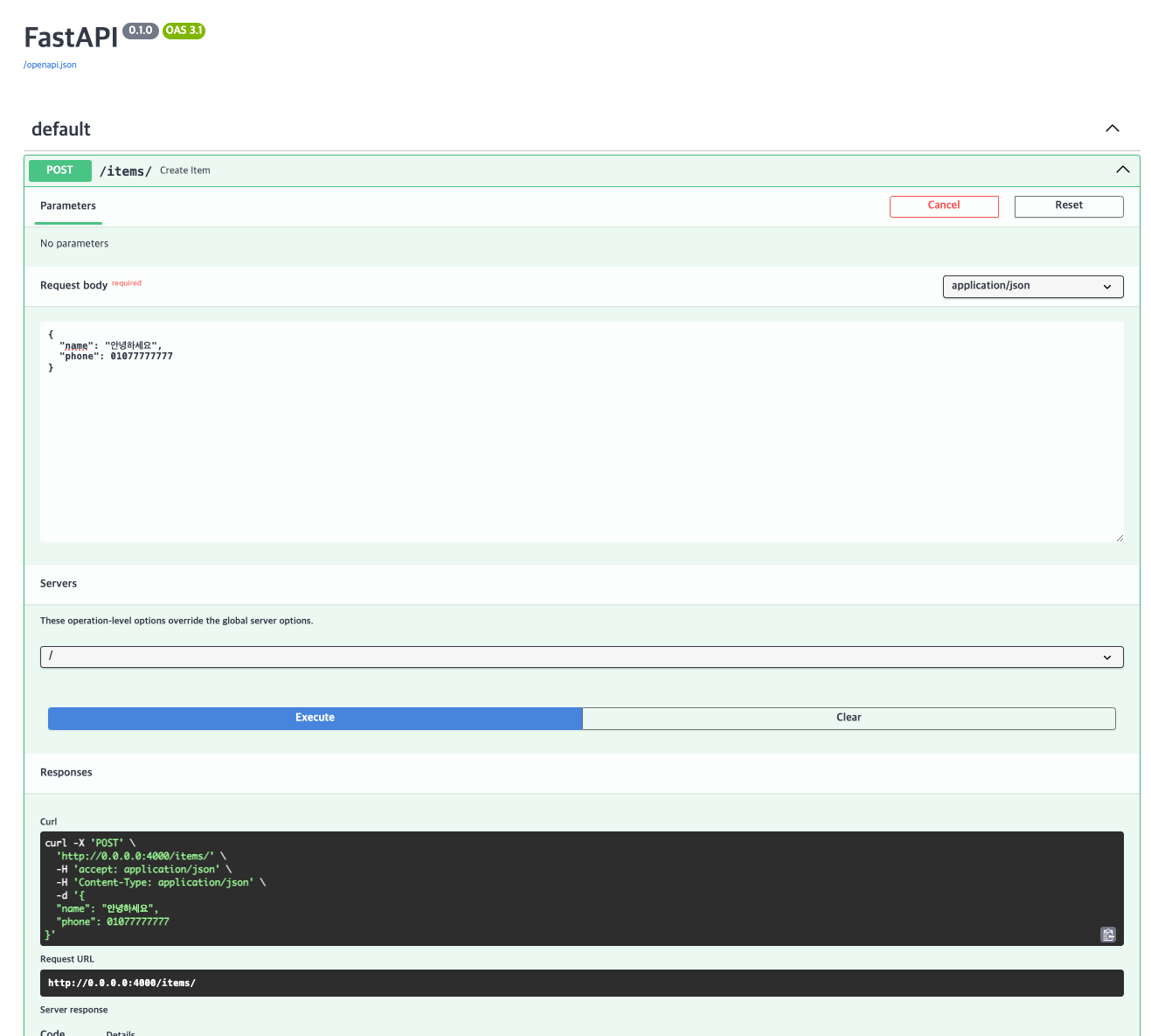 http://0.0.0.0:4000으로 접속해서 name을 "안녕하세요", phone을 01077777777로 보냈을 때 Curl을 보자.