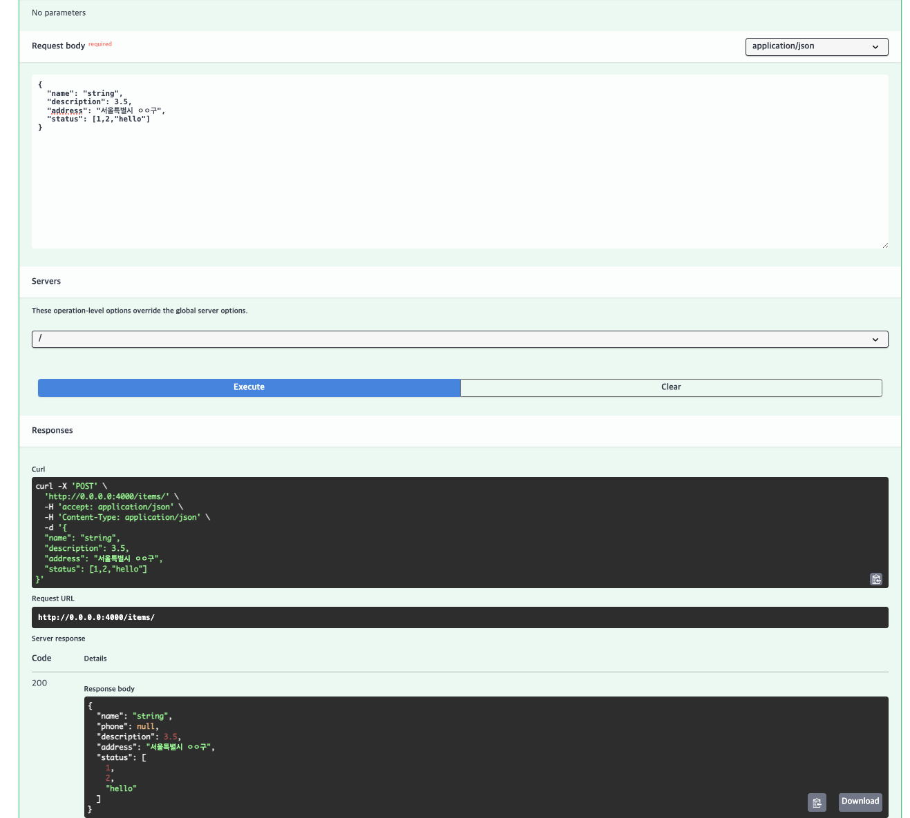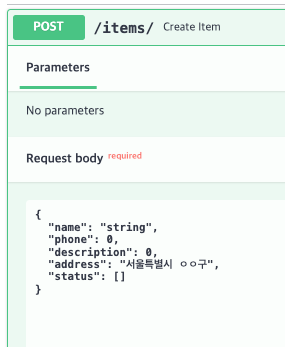 address : str = Field(example='서울특별시 ㅇㅇ구') #str 타입이고, 예시 설명을 추가