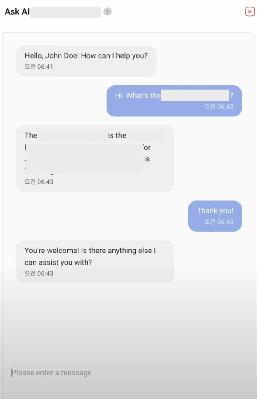 3. 답변 수신 후 : 챗봇 답변이 표출되며 메세지 입력창이 활성화되며 다시 자동 포커스된다.