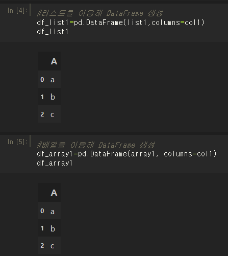 이제 이 리스트와 배열을 이용해 데이터프레임 생성을 해보자.