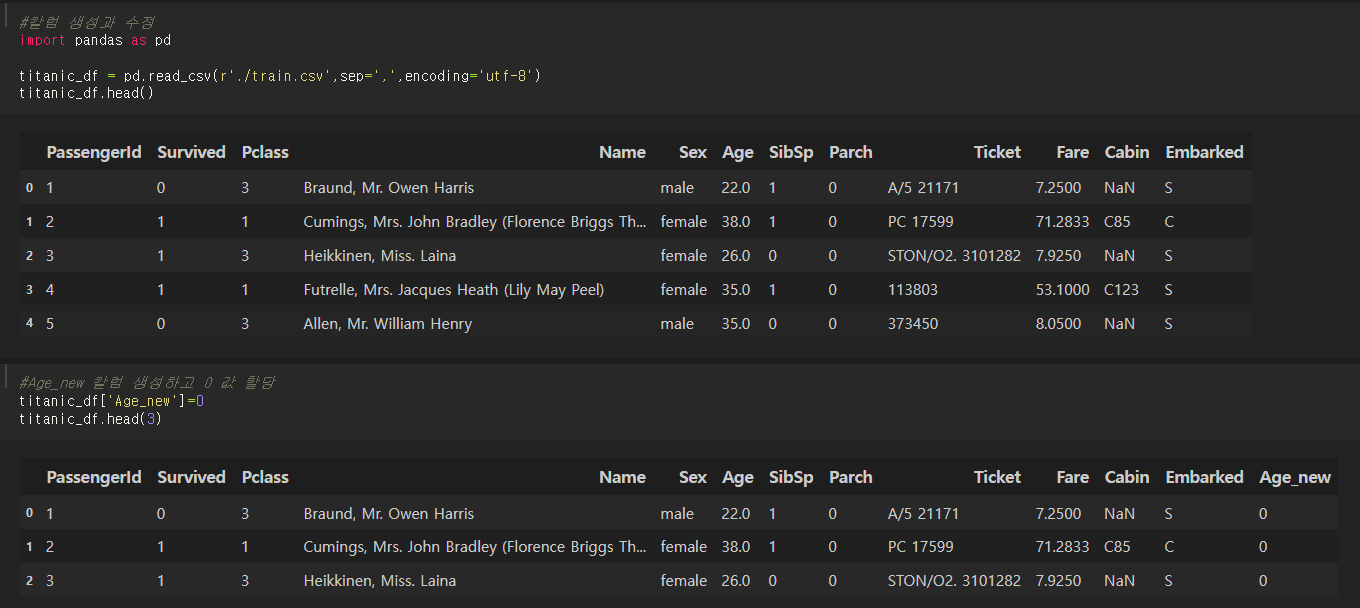캐글 타이타닉 데이터프레임을 불러와서 새로운 칼럼 Age_new를 추가하고 일괄적으로 0 값을 할당해보자.