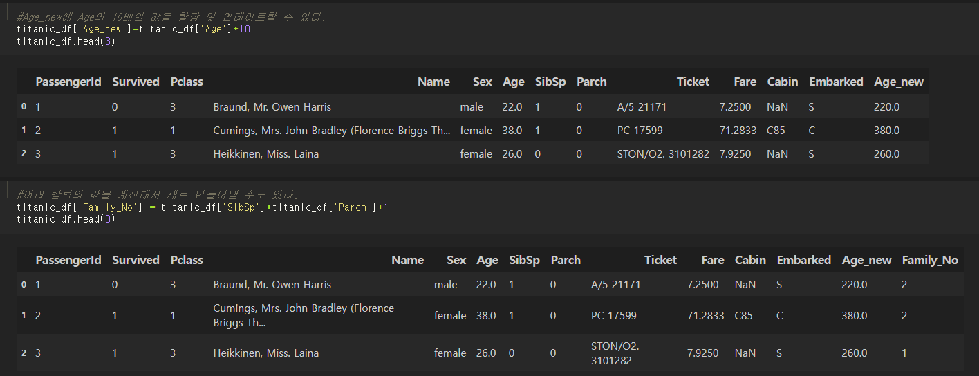 df2 = titanic_df.drop(['Age_new', 'Family_No'], axis=1)와 같이 새로운 변수명에 지정해서 할당을 해주는 편이다.