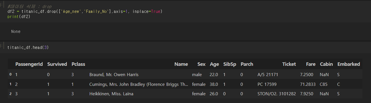 df2 = titanic_df.drop(['Age_new', 'Family_No'], axis=1, inplace=True)와 같이 df2라는 데이터프레임에 저장을 한다 해도 df2를 반환하면 None이라고 뜨고, 원본 데이터프레임이었던 titanic_df에서 ['Age_new', 'Family_No'] 두 칼럼이 삭제되었음을 확인할 수 있다.