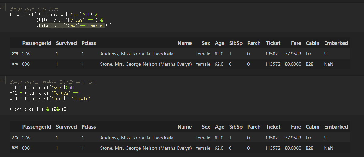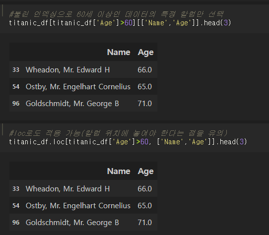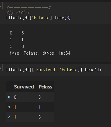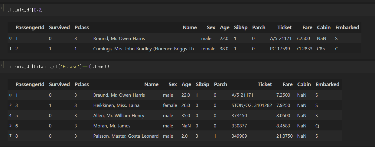 하지만 위에서 언급한 것처럼, titanic_df [0:2]와 같이 인덱스 형태로 변환 가능한 표현식은 입력 가능하다.