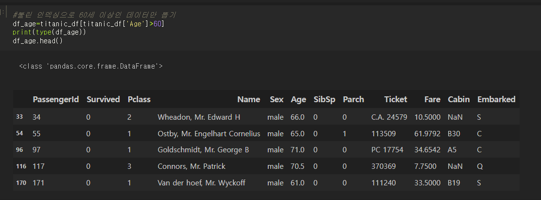 타이타닉 데이터에서 나이가 60세 이상인 데이터만 찾아보자.