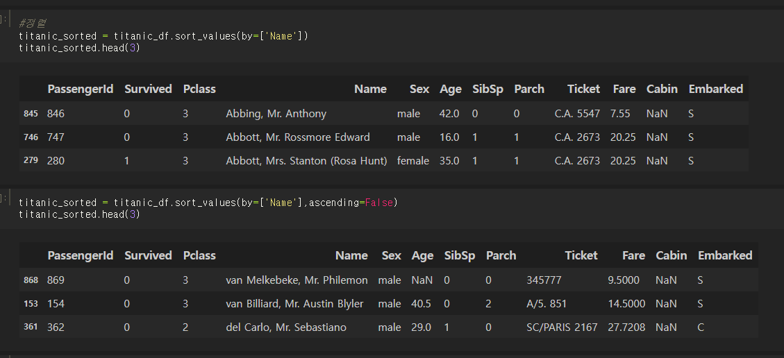 inplace=True 로 데이터프레임의 정렬 결과를 그대로 적용할 수도 있다.(기본은 False)
