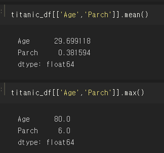 df[['Age','Fare']].mean() 과 같이 원하는 특정 칼럼만 선택해서 값을 확인할 수도 있다.