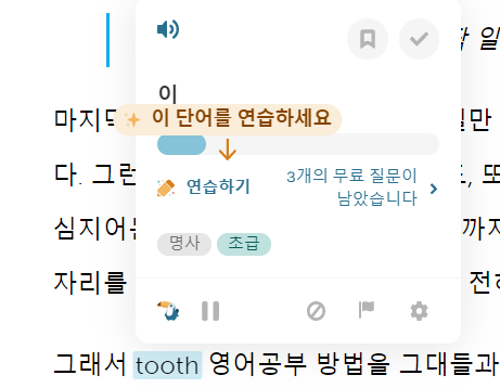 또 하나, 아직 사전 업데이트가 많이 안 되어 있어서인지, 특정 단어만 변환을 한다는 점과 Advanced 레벨을 선택했음에도 다소 쉬운 단어들만이 번역된다는 점이 아쉬웠다.