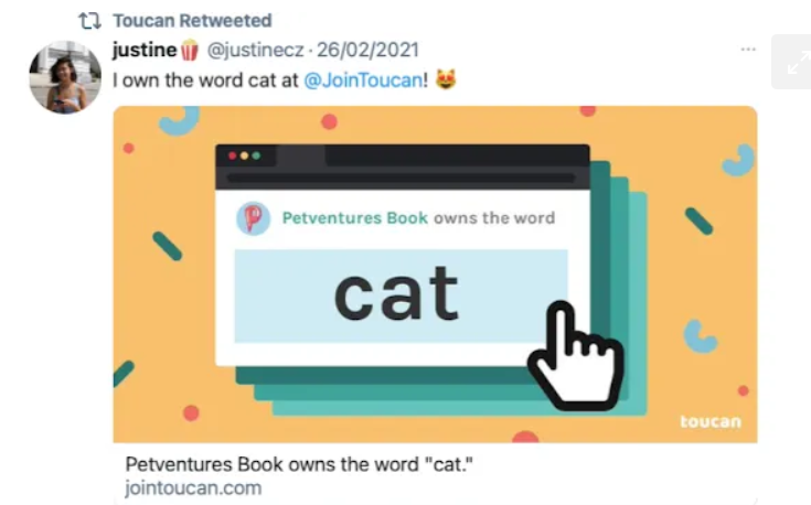 Own The Word로 투칸(Toucan)은 사람들이 플랫폼에서 단어를 소유하는 대가로 월 4달러를 지불하게 만들었다. 게다가 구매한 내용을 널리 공유할 수 있게 되었다(결국 사용자에게 가장 큰 이익이 되었기 때문). 특정 단어에 대한 더 많은 수요 생성, 즉 더 많은 사람들이 단어를 구매하는 것으로 번역과 동시에 Toucan(회사)에 대한 단어 또한 홍보가 된다.