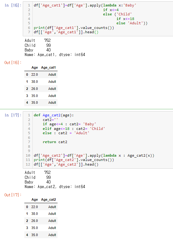 titanic 데이터의 Age 값을 4세 이하는 Baby, 5세~18세 이하는 Child, 나머지는 Adult로 분류하기 위해서는