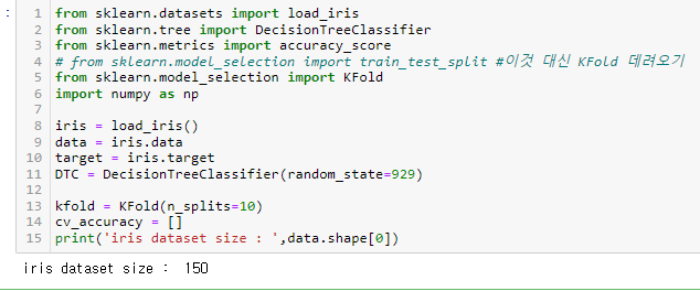 150개의 데이터가 있으므로, 데이터셋을 10개로 분리하면 각각 15개씩 10등분된다.