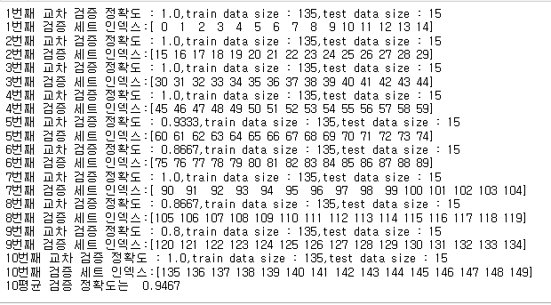 print(f'{i}번째 교차 검증 정확도 : {accuracy},train data size : {train_size},test data size : {test_size}')