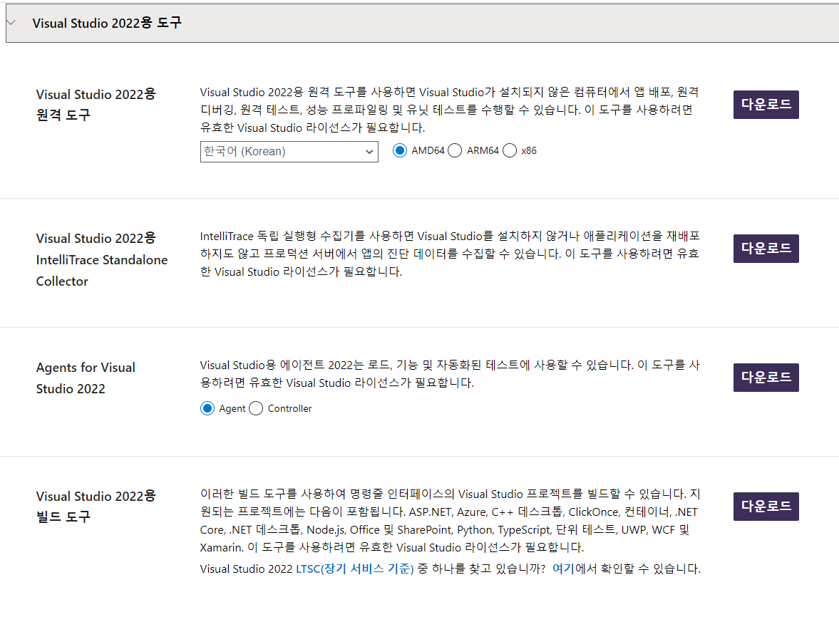2. 다운로드 페이지의 하단으로 이동해서 Visual Studio 2022용 도구-Visual Studio 2022용 빌드 도구 선택하여 다운로드 버튼 클릭(위에서 네번째)
