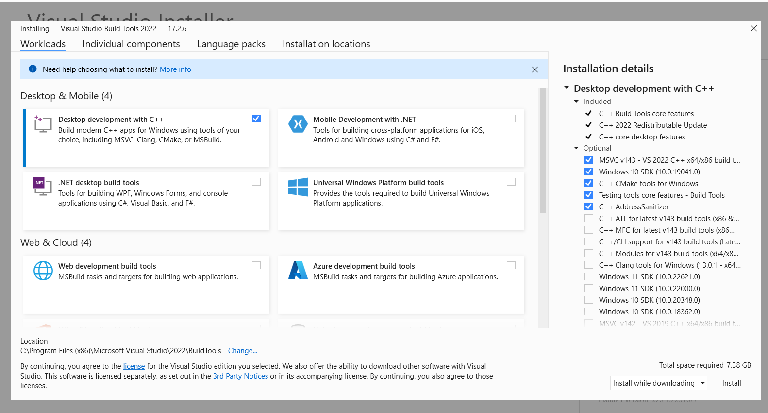 4. Visual C++ 빌드 도구를 클릭해 선택한 다음, 오른쪽 아래의 설치를 눌러서 완료하기