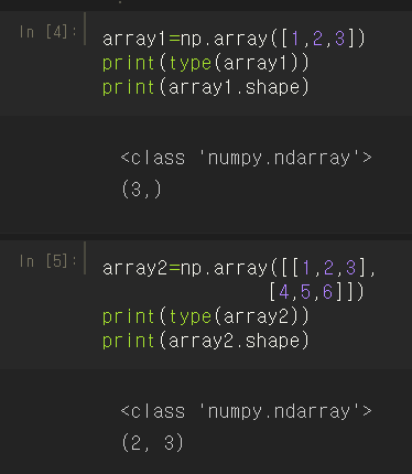array1과 array3, array4의 데이터 건수는 동일하지만 차원은 다르다. 이렇게 차원이 달라서 오류가 발생하는 경우가 많다.