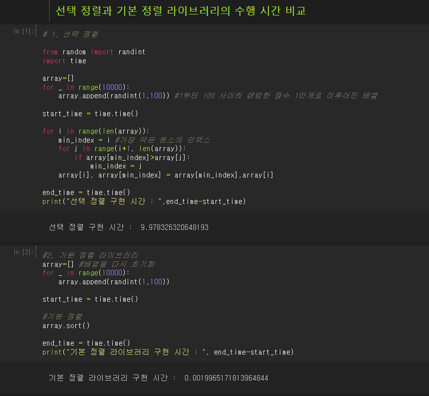 실제로 구현 시간을 비교해보니, 1만개의 배열을 정렬하는 데