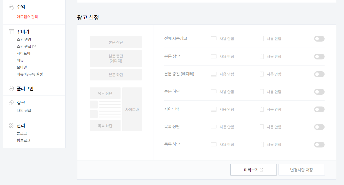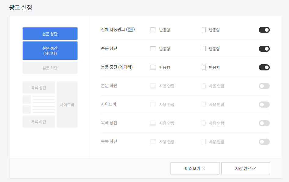 나는 전체 자동광고와 본문 상단, 본문 중간만 광고를 켜 두었다. 추후 광고를 좀 더 조정하면서 내 블로그에 맞도록 조금씩 수정할 계획이다.