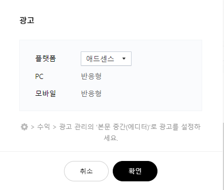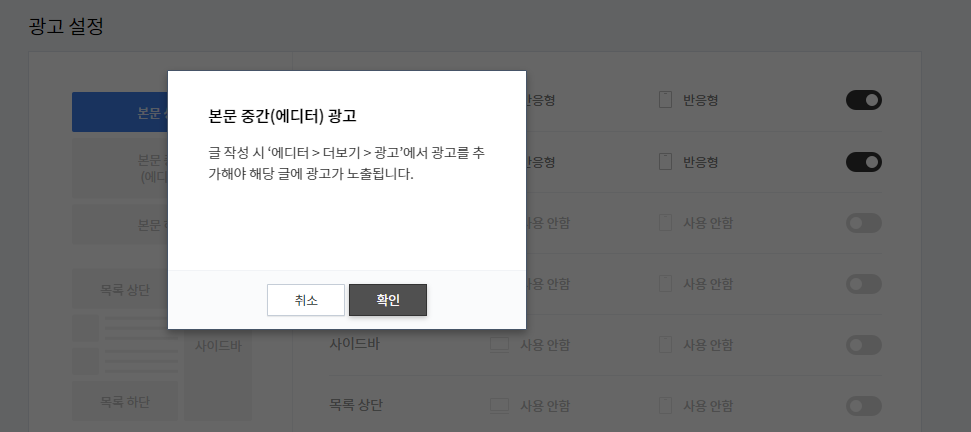 특히 본문 중간(에디터)의 경우에는 글 작성 시 에디터-더보기-광고에서 추가를 해야 한다고 한다.