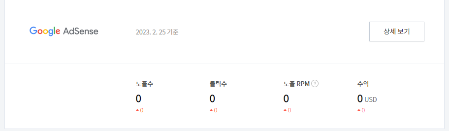 빠르게 잘 연동된 것을 확인할 수 있다. 이제 막 게재했기 때문에 노출도, 클릭도, RPM도, 수익도 모두 0이다.