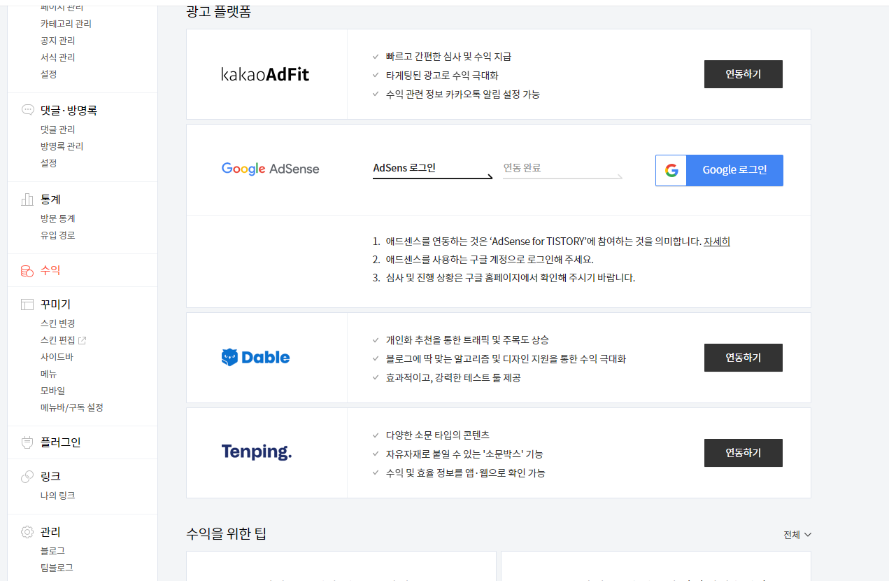 관리 페이지의 왼쪽 "수익"을 클릭하면 여러 광고 플랫폼이 기재되어 있는데, 그 중 Google Adsense의 연동하기 버튼을 눌러주었다.