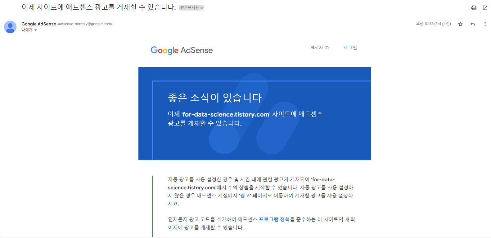 메일 제목은 "이제 사이트에 애드센스 광고를 게재할 수 있습니다"이다.