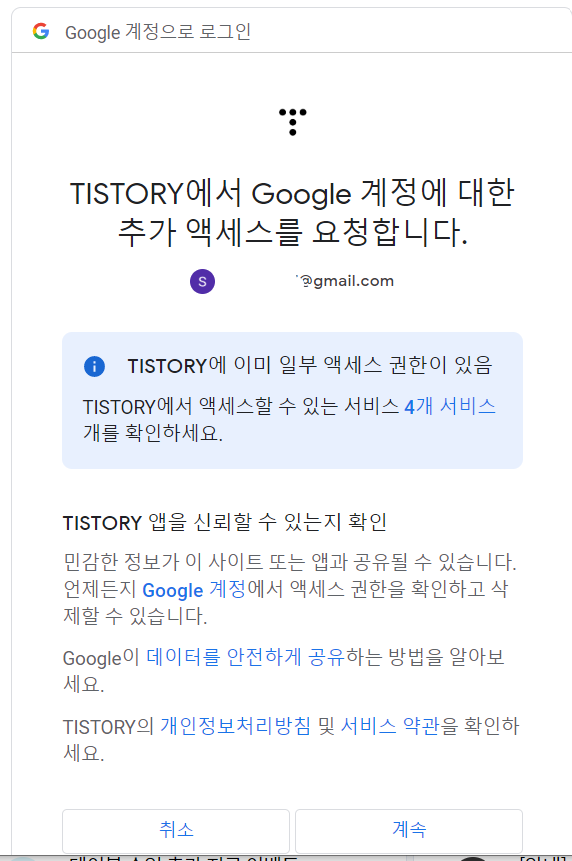구글 계정에 로그인하고, 티스토리에게 접근 권한을 주겠냐는 의미의 확인 창이 하나 뜨는데 "계속"을 눌러주었다.