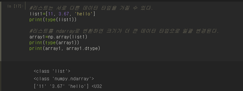 리스트는 서로 다른 데이터 타입을 가질 수 있기 때문에, 리스트에서 ndarray로 변경할 때 데이터 타입이 다르다면 크기가 더 큰 데이터 타입으로 일괄 변경된다.