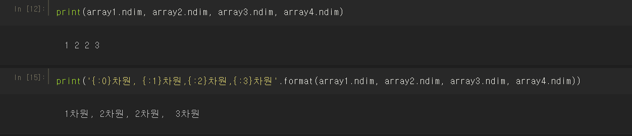 현재 차원이 몇차원인지 바로 뽑아내는 함수는 ndim이다. 아래와 같이 차원을 확인할 수 있다.