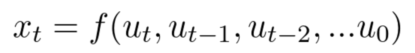 현재 시간의 상태(x_t)는 이전 시간의 상태(x_(t-1))와 현재의 입력(u_t)과 관계있게 된다.