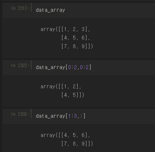 data_array1[0:3] 은 인덱스 0부터 3 직전까지 즉 0,1,2라는 인덱스를 뽑아낸다. 다시 말해 첫 번째, 두 번째, 세 번째 값을 반환한다.