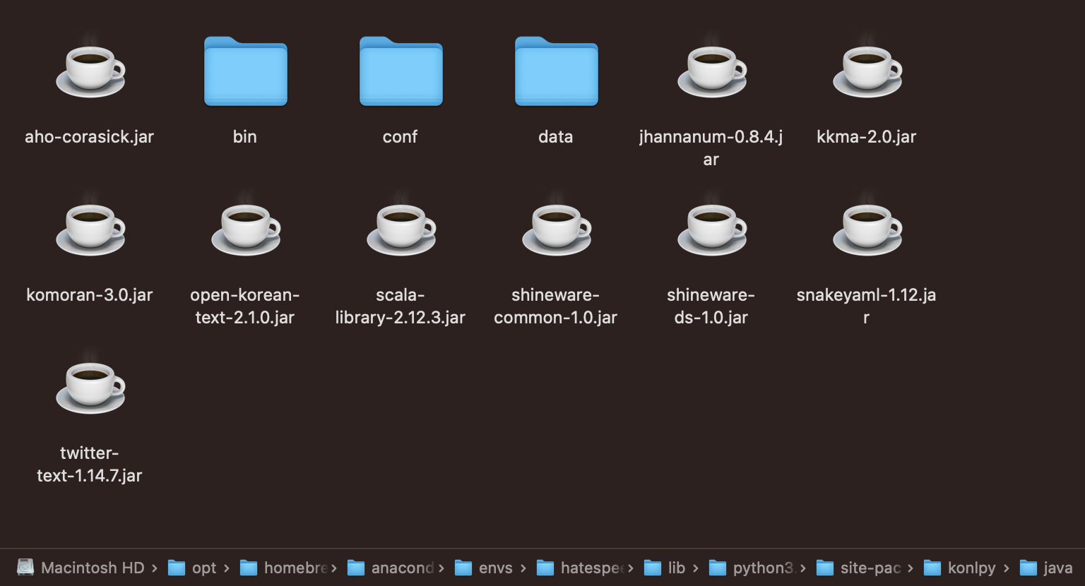 5. lib > python3.9(가상환경 파이썬 버전) > site-packages > konlpy > java로 접속하면 아래와 같은 화면을 볼 수 있다.