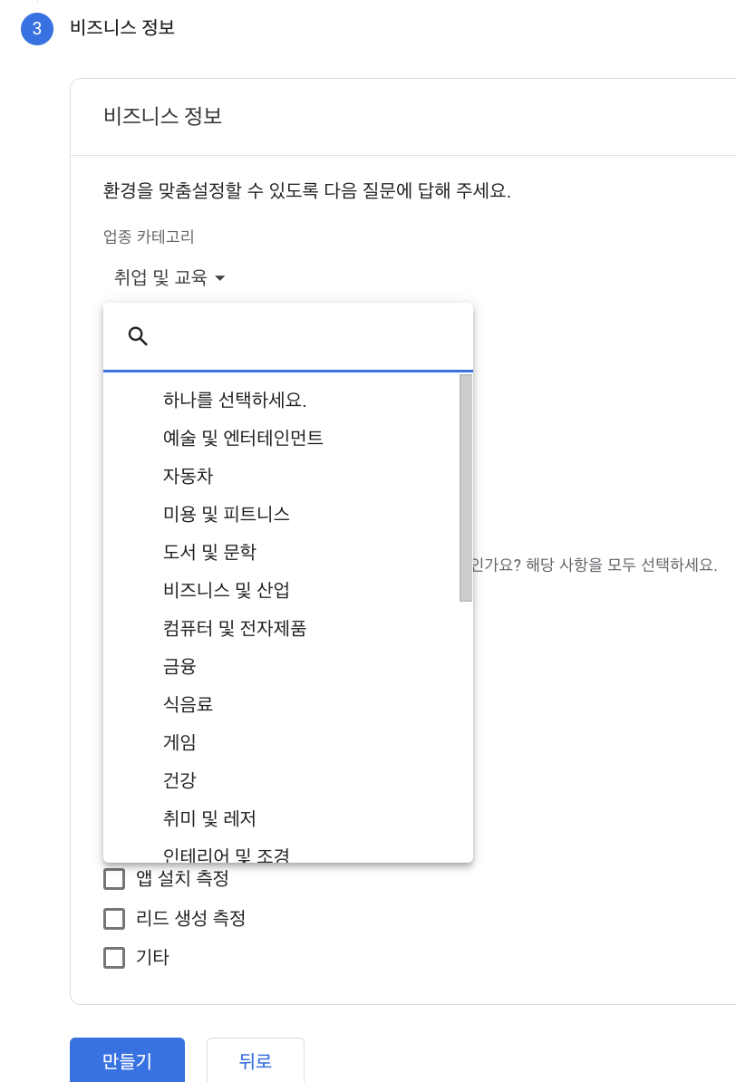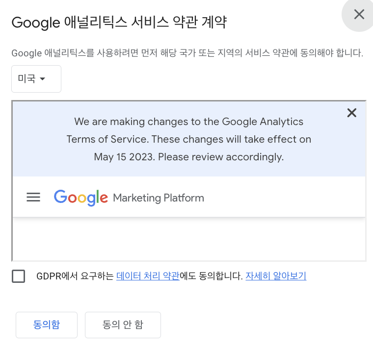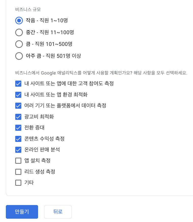 5. '만들기'버튼을 눌러 서비스 약관 계약까지 동의해주고 나면 google analytics 시작하기 준비 끝!