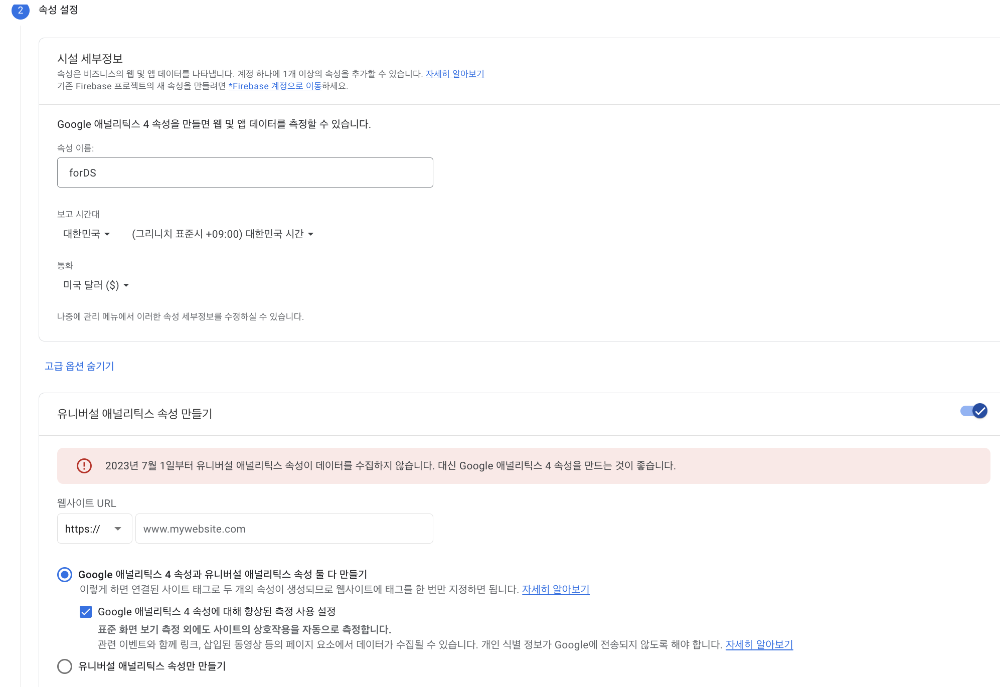 아래와 같이 고급 옵션을 열어보면 유니버설 애널리틱스 속성 만들기 옵션이 뜬다.