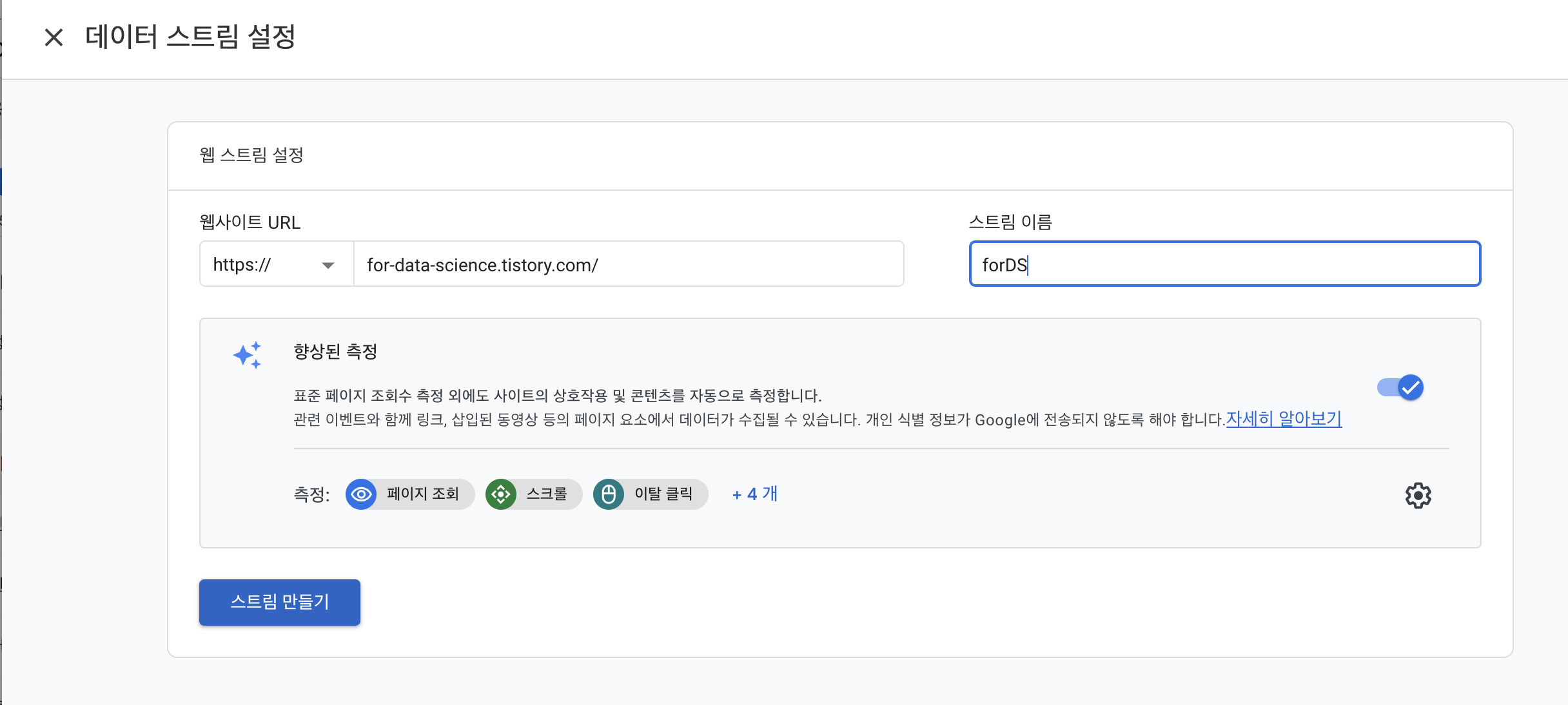 6. 이제 내 웹사이트를 추가해줄 단계다. 데이터를 수집할 소스, 즉 데이터 스트림을 설정해주는 단계!