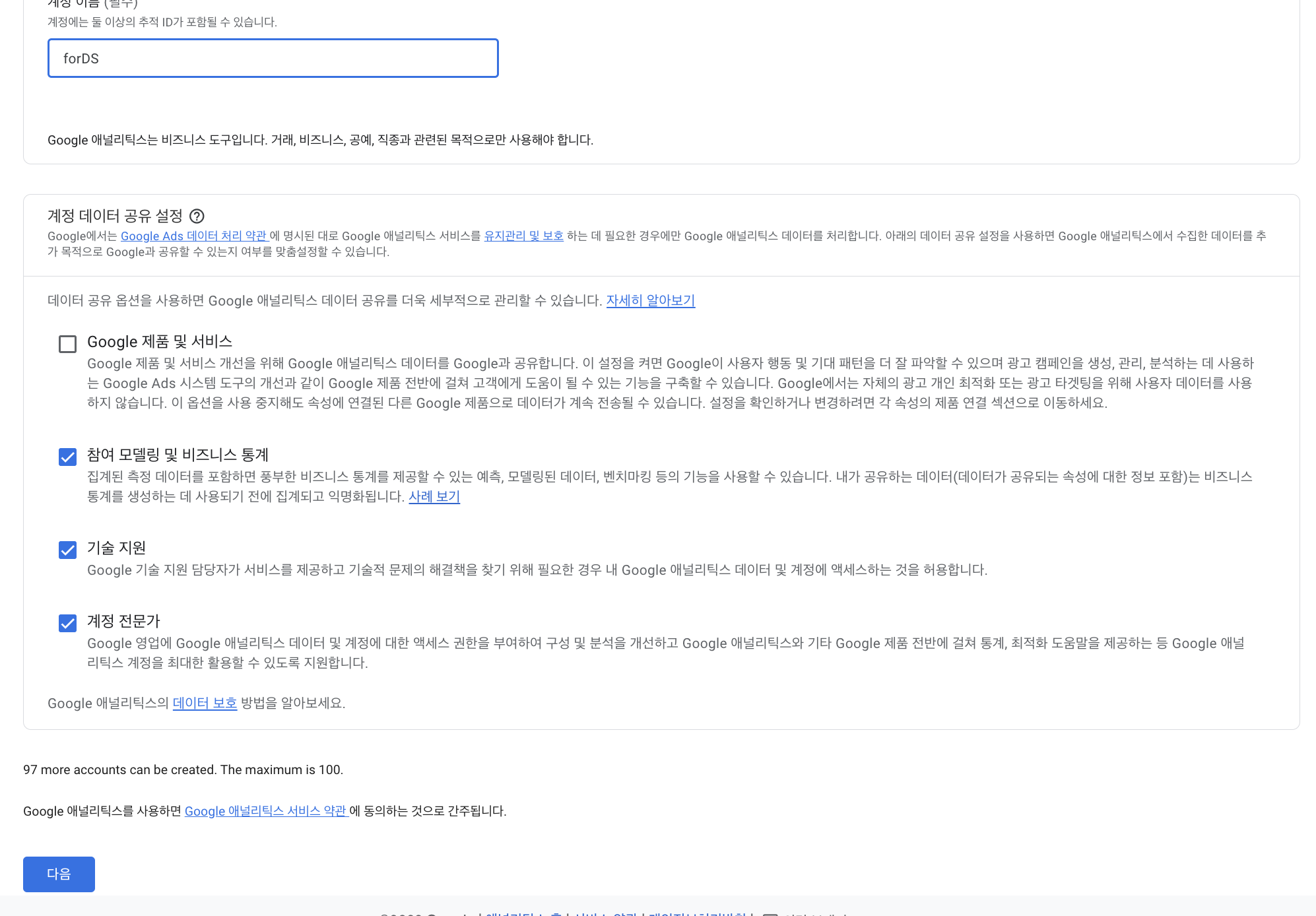 2. 계정이름을 원하는 이름으로 입력해준 후, 계정 데이터 공유를 설정해준다.