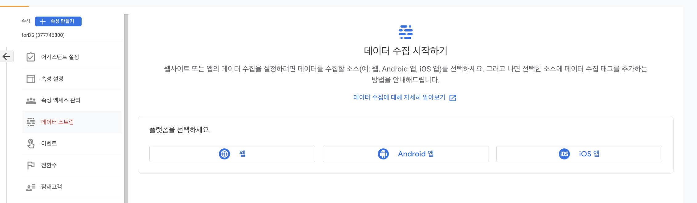 6. 이제 내 웹사이트를 추가해줄 단계다. 데이터를 수집할 소스, 즉 데이터 스트림을 설정해주는 단계!