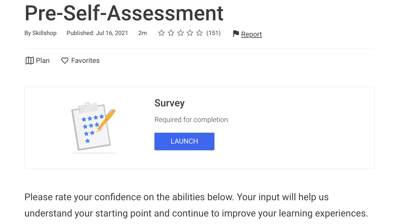 몇 가지 질문에 답한다. 기재된 사항을 얼마나 잘 할 수 있는지 체크하는 것인데, 우리가 어떤 수준에서 시작하는지를 파악해서 학습 경험을 개선하고자 하기 위함이니 솔직하게 대답했다. 3문항밖에 되지 않아서 10초만에 끝!