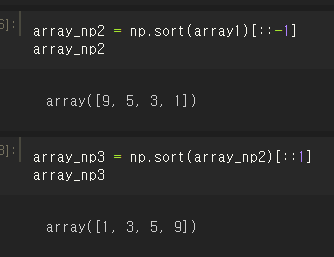 위의 방식은 default값인 오름차순으로 정렬된 것인데, 내림차순은 np.sort()[::-1] 으로 설정할 수 있다.