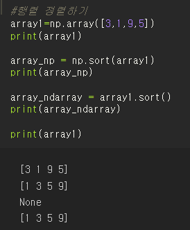 배열명.sort()는 행렬 자체를 정렬해서 변환하는 것이다. 반환되는 값은 None이라는 점!