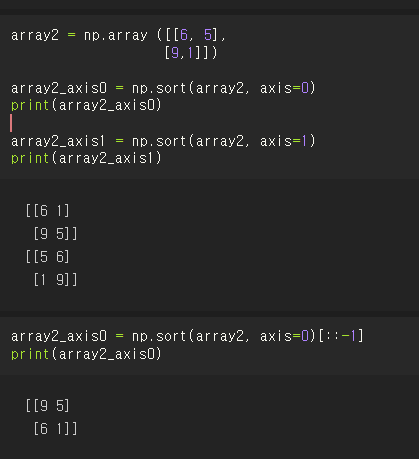 axis=0을 오름차순 혹은 내림차순 정렬을 하는 방법은 동일하게 np.sort(배열, 기준축)[::-1] 과 같이 입력하면 된다.