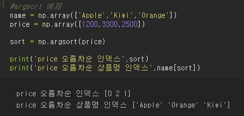 판다스와 달리 넘파이에서는 실제 값과 그 값이 뜻하는 데이터를 별도의 ndarray로 각각 가져야 하는데, 물건 이름과 가격을 표현하려면 각각의 ndarray로 활용할 수밖에 없다. 이때 np.argsort(price_array)를 이용해 인덱스를 반환하고, 이를 name_array에 팬시 인덱스로 적용시켜 추출할 수 있기 때문에 데이터 추출에 굉장히 유용하다.