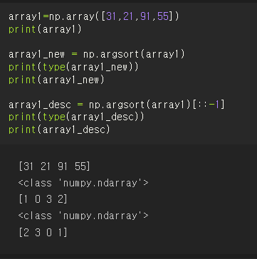 np.argsort(배열명)[::-1] 로 내림차순으로 정렬하는 것도 역시 가능하다.
