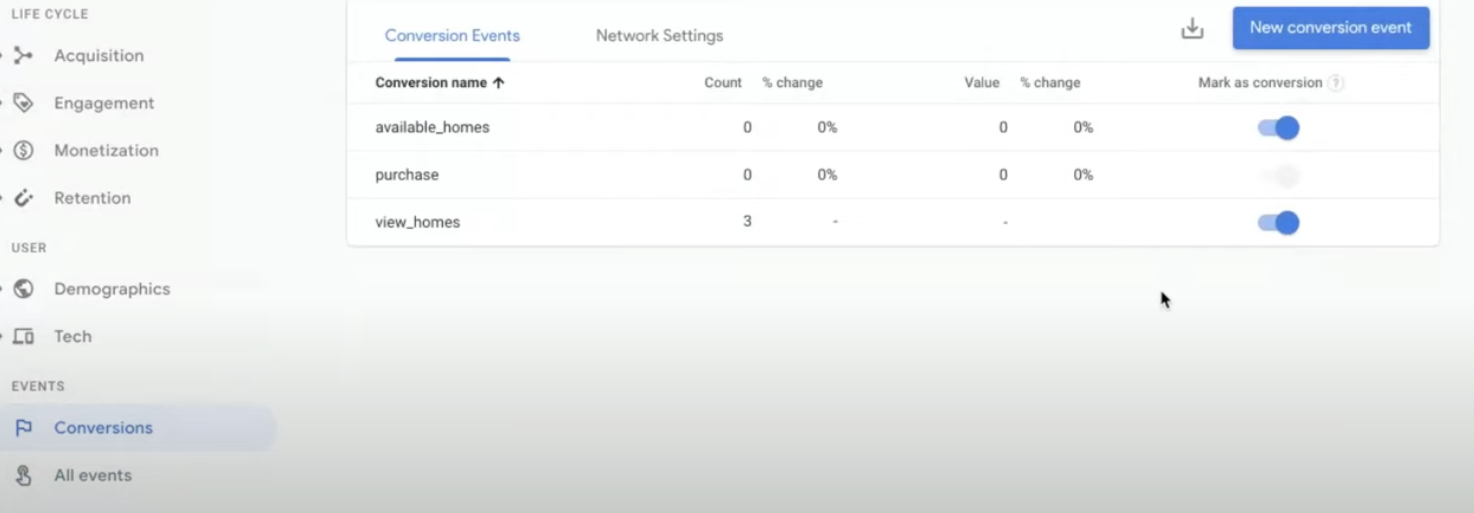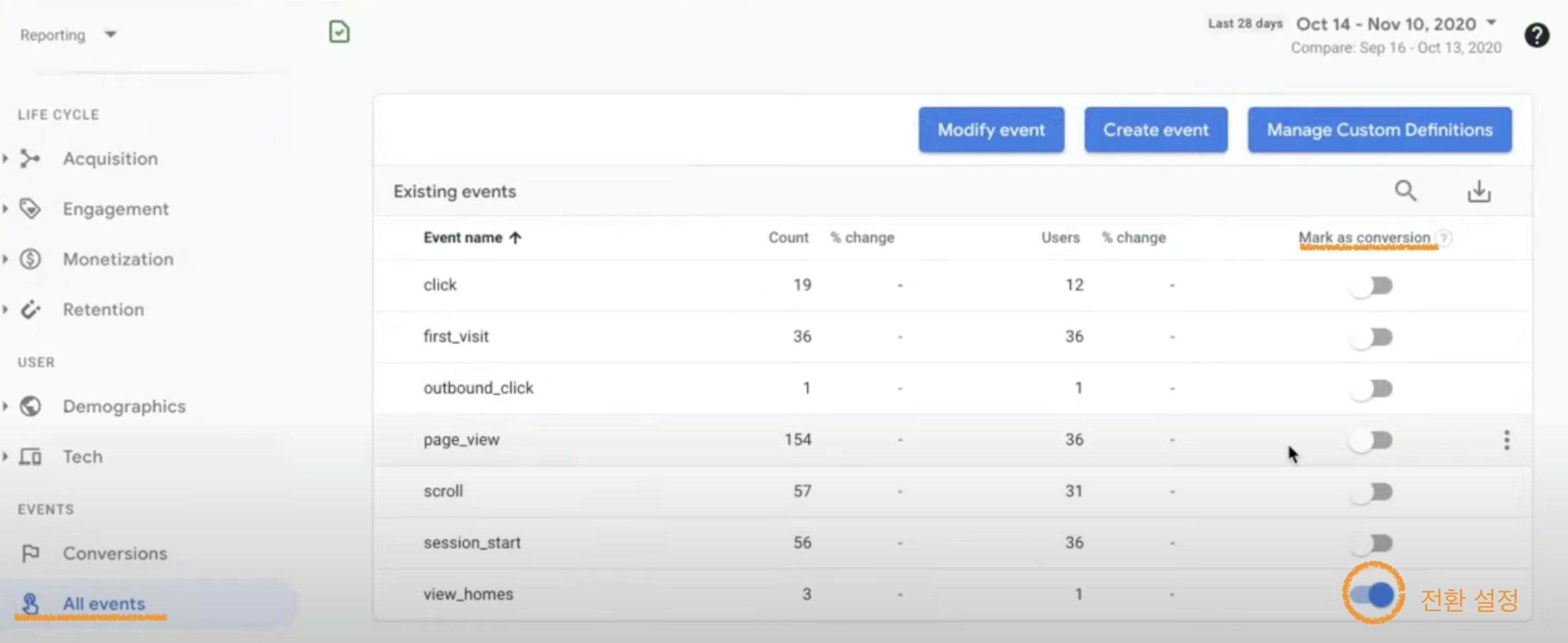 All events- Mark as conversion을 켜고 꺼서 전환으로 사용할 이벤트를 설정 가능하다.