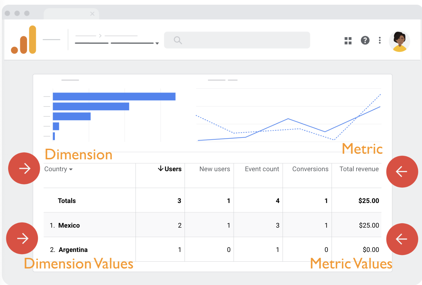 만일 '아르헨티나에서 온 유저는 몇 명인가?' 라는 질문이 있다면, dimension=아르헨티나, metric=몇 명(how many)