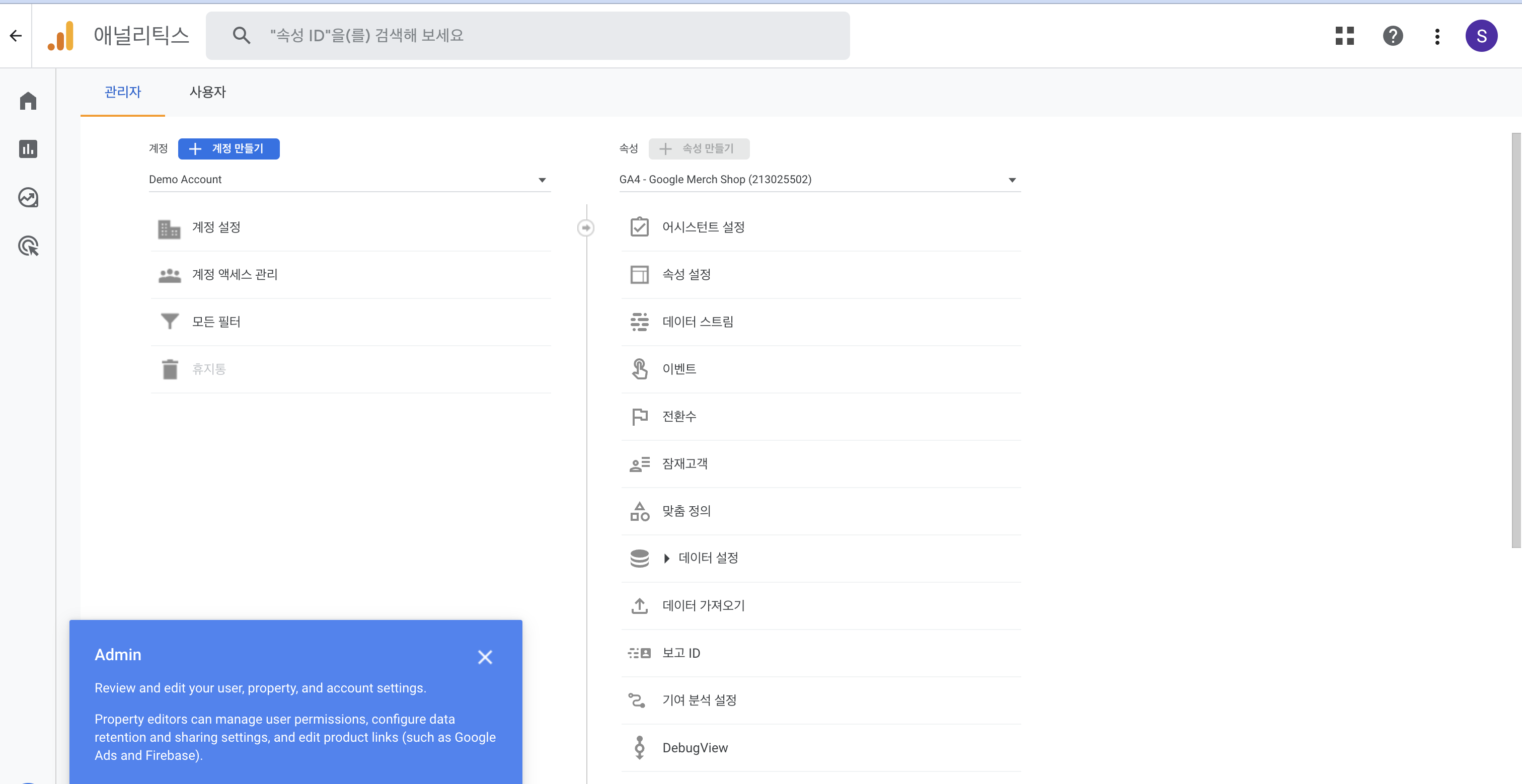 가장 하단의 관리 탭에서는 계정과 속성에 대한 설정을 할 수 있다.